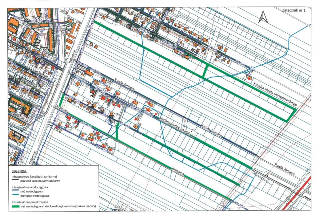 Trwają prace projektowe mające na celu w przyszłości budowę sieci wodociągowej i kanalizacyjnej na terenie osiedla Zatorze to jest ulicy Gerwatowskiego oraz ulicach równoległych: Kolejowej, Budzyńskiego i Kraśnica.
